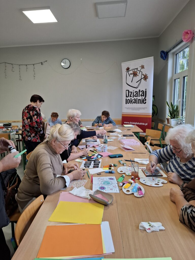 - „Malowanie na szkle oraz mandali” – pozwalające seniorom wyrazić się artystycznie i odnaleźć chwilę relaksu w twórczym działaniu. W ciszy i skupieniu powstały barwne, pełne emocji prace.