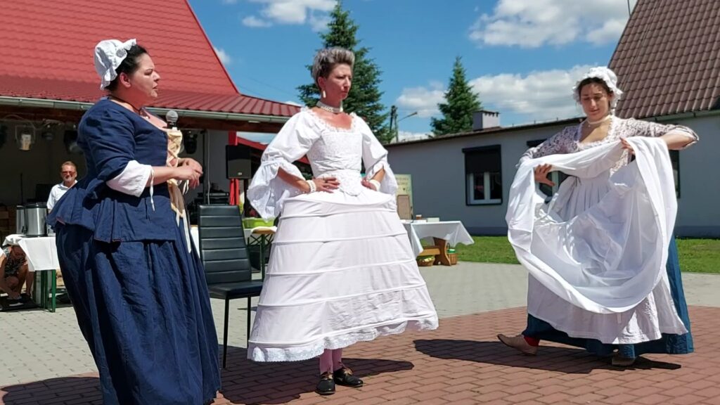 Kolejna grupa rekonstrukcyjna poprowadziła pokaz i warsztat dotyczący starodawnej mody cywilnej. Czwartym warsztatem była suknia hrabiny, czyli barwienie materiałów naturalnymi składnikami, tworzenie symbolicznych pierścieni z drutu i ekologicznej sukni hrabiny.