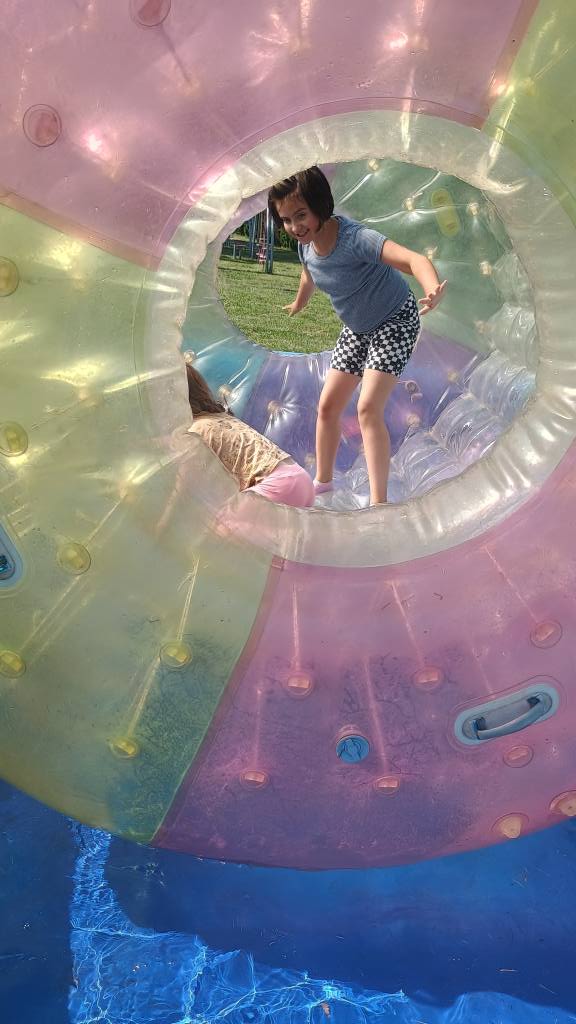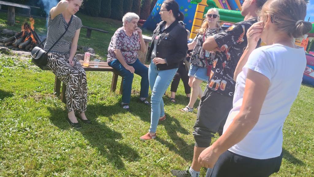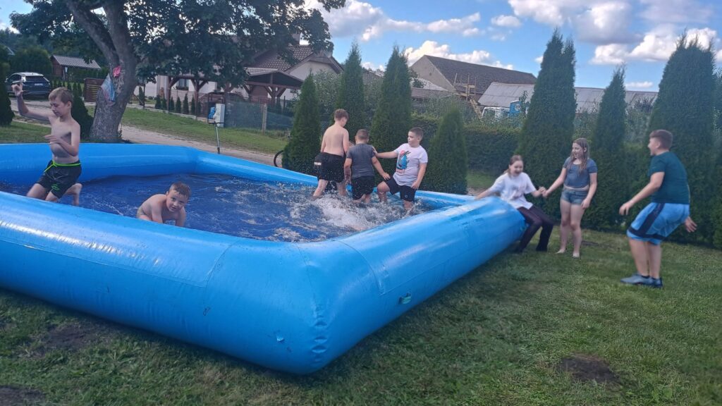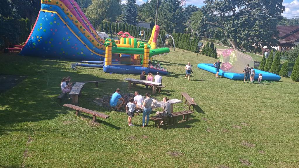 Główną atrakcją były zamki dmuchane, z których dzieciaki prawie w ogóle nie schodziły. Fajną zabawą była także duża piłka na wodzie. W trakcie szaleństw można było się również posilić , w tym roku postawiliśmy na zdrowe przekąski, czyli owocowe szaszłyki, a do picia była woda cytrynowa i malinowa ze świeżymi owocami. Oczywiście nie zabrakło też kiełbasek z ogniska.